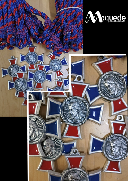 En el día de hoy hemos entregado estas preciosas medallas para el Rescatado de Lebrija. Medallas realizadas desde cero, bañadas en plata envejecida y con esmalte en azul y rojo, con la cruz tradicional del Rescatado. Acompañadas del cordón de seda a dos colores.